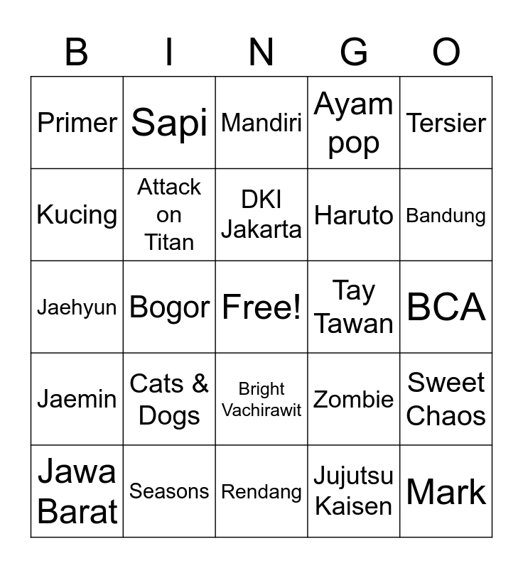 This bingo card has a free space and 24 words: Cats & Dogs, Seasons, DKI Jakarta, Jawa Barat, Tersier, Primer, Kucing, Sapi, Tay Tawan, Bright Vachirawit, Haruto, Jaehyun, Zombie, Sweet Chaos, Attack on Titan, Jujutsu Kaisen, BCA, Mandiri, Bandung, Bogor, Mark, Jaemin, Ayam pop and Rendang.