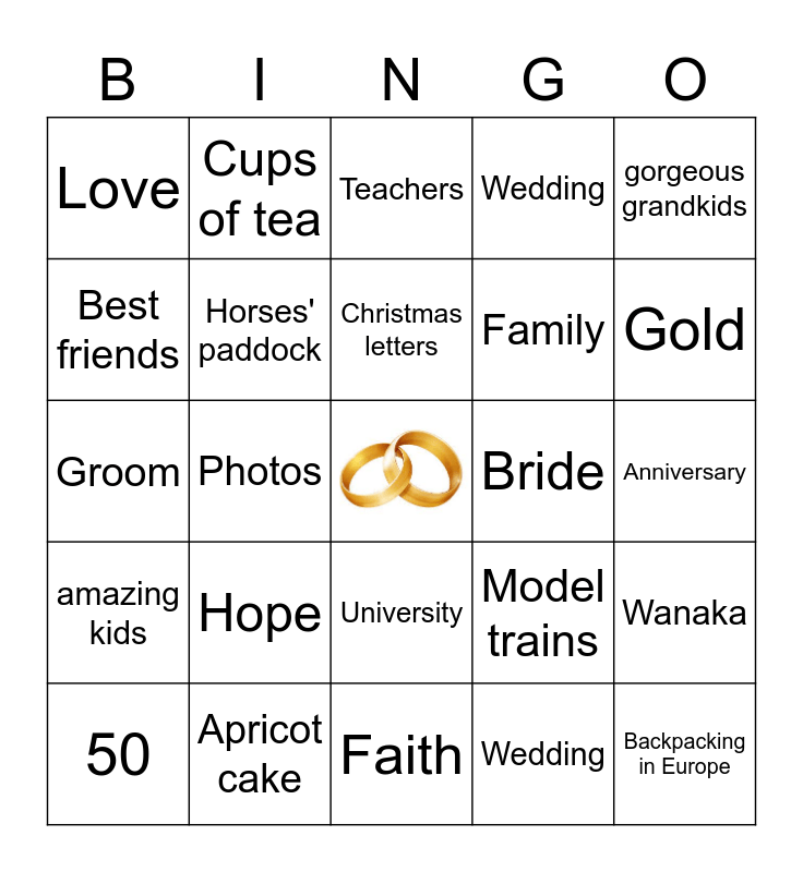 This bingo card has a free space and 27 words: Model trains, Youth group fun, Family, Faith, Best friends, Teachers, Cups of tea, amazing kids, Bride, Wanaka, Groom, Wedding, 50, Apricot cake, Gold, Blessed, Horses' paddock, Christmas letters, Hope, Love, Anniversary, Wedding, Photos, Backpacking in Europe, University, gorgeous grandkids and Pumpkin scones.