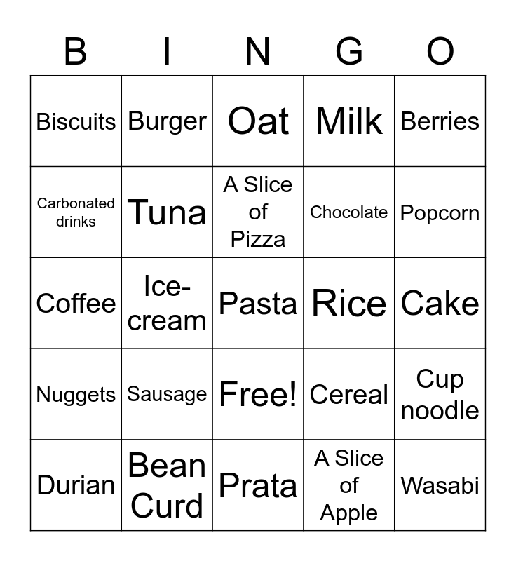 This bingo card has 26 words: Free!, A Slice of Apple, A Slice of Pizza, Bean Curd, Berries, Biscuits, Carbonated drinks, Burger, Cake, Cereal, Chocolate, Coffee, Cup noodle, Durian, Ice-cream, Jam, Milk, Nuggets, Oat, Pasta, Popcorn, Prata, Rice, Sausage, Tuna and Wasabi.