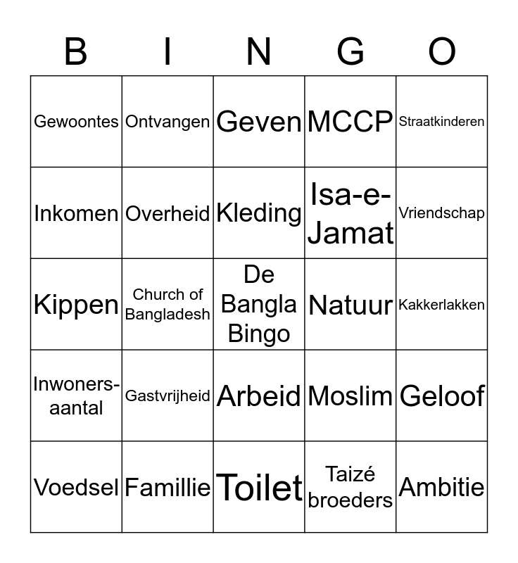 This bingo card has a free space and 28 words: Geloof, Verkeer, Isa-e-Jamat, Taizé broeders, Inkomen, Geven, Ontvangen, Inwoners- aantal, Natuur, Voedsel, Kippen, MCCP, Famillie, Toilet, Vriendschap, Huizen, Gastvrijheid, Overheid, Kleding, Arbeid, Gewoontes, Broeder Guillaume, Ambitie, Church of Bangladesh, Kakkerlakken, Moslim, Straatkinderen and Bloemen.