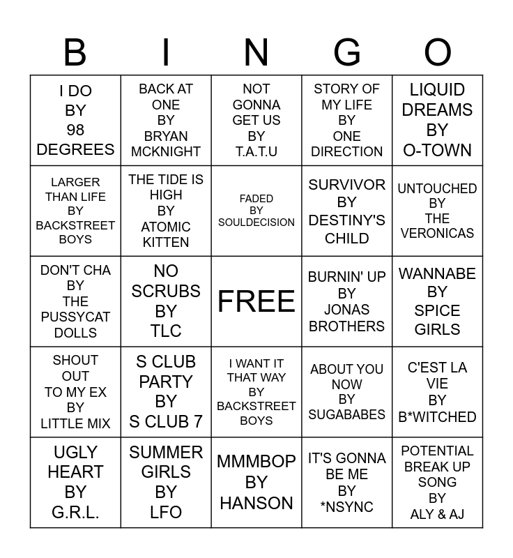This bingo card has a free space and 26 words: I WANT IT THAT WAY BY BACKSTREET BOYS, IT'S GONNA BE ME BY *NSYNC, FADED BY SOULDECISION, SUMMER GIRLS BY LFO, LIQUID DREAMS BY O-TOWN, I DO BY 98 DEGREES, LARGER THAN LIFE BY BACKSTREET BOYS, BACK AT ONE BY BRYAN MCKNIGHT, WANNABE BY SPICE GIRLS, ABOUT YOU NOW BY SUGABABES, SURVIVOR BY DESTINY'S CHILD, DON'T CHA BY THE PUSSYCAT DOLLS, C'EST LA VIE BY B*WITCHED, UGLY HEART BY G.R.L., NO SCRUBS BY TLC, WHO'S LOVIN' YOU BY THE JACKSON 5, STORY OF MY LIFE BY ONE DIRECTION, SHOUT OUT TO MY EX BY LITTLE MIX, NOT GONNA GET US BY T.A.T.U, POTENTIAL BREAK UP SONG BY ALY & AJ, UNTOUCHED BY THE VERONICAS, MMMBOP BY HANSON, BURNIN' UP BY JONAS BROTHERS, S CLUB PARTY BY S CLUB 7, THE TIDE IS HIGH BY ATOMIC KITTEN and LADY MARMALADE BY CHRISTINA AGUILERA, MYA, P!NK & LIL KIM.