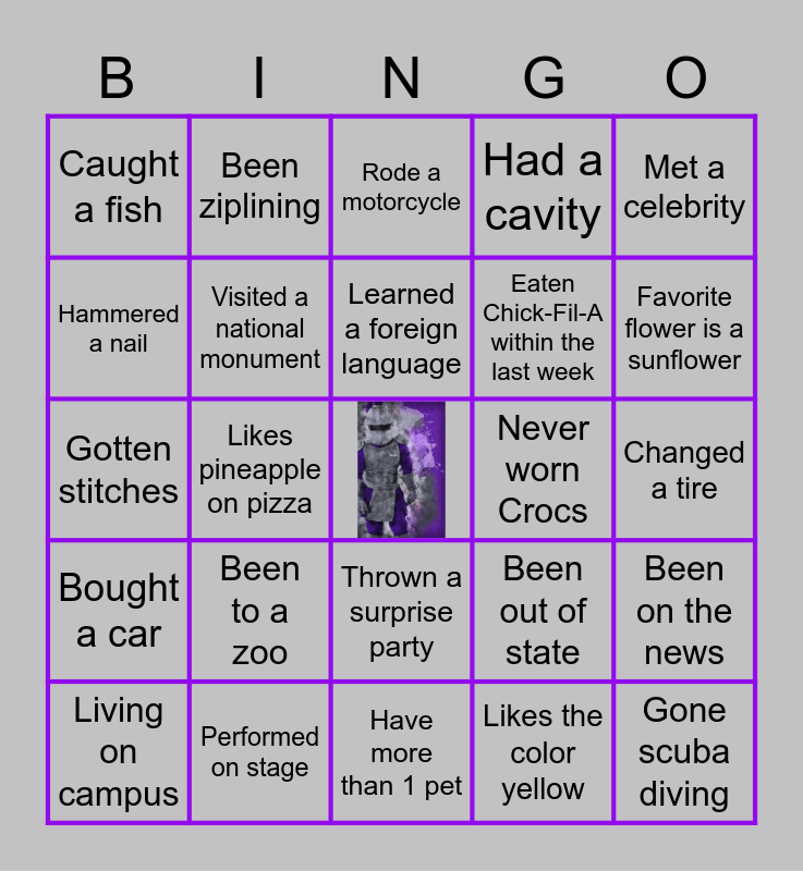 This bingo card has a free space and 24 words: Living on campus, Been to a zoo, Learned a foreign language, Likes the color yellow, Met a celebrity, Caught a fish, Been ziplining, Rode a motorcycle, Never worn Crocs, Changed a tire, Gotten stitches, Visited a national monument, Been out of state, Been on the news, Hammered a nail, Performed on stage, Have more than 1 pet, Had a cavity, Favorite flower is a sunflower, Bought a car, Likes pineapple on pizza, Thrown a surprise party, Eaten Chick-Fil-A within the last week and Gone scuba diving.