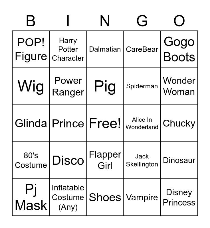 This bingo card has a free space and 24 words: Disco, Inflatable Costume (Any), Pig, Pj Mask, Gogo Boots, POP! Figure, Wig, Harry Potter Character, Alice In Wonderland, Flapper Girl, Spiderman, Glinda, Jack Skellington, Dinosaur, Power Ranger, Vampire, Chucky, Dalmatian, Wonder Woman, Prince, Disney Princess, 80's Costume, CareBear and Shoes.