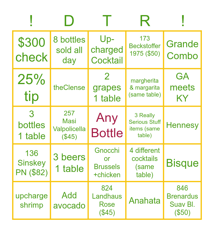This bingo card has a free space and 24 words: 3 beers 1 table, Add avocado, 2 grapes 1 table, upcharge shrimp, Grande Combo, $300 check, 25% tip, 8 bottles sold all day, 3 Really Serious Stuff items (same table), Gnocchi or Brussels +chicken, margherita & margarita (same table), 3 bottles 1 table, 4 different cocktails (same table), Bisque, theClense, Anahata, Hennesy, Up-charged Cocktail, GA meets KY, 257 Masi Valpolicella ($45), 846 Brenardus Suav Bl.($50), 136 Sinskey PN ($82), 173 Beckstoffer 1975 ($50) and 824 Landhaus Rose ($45).