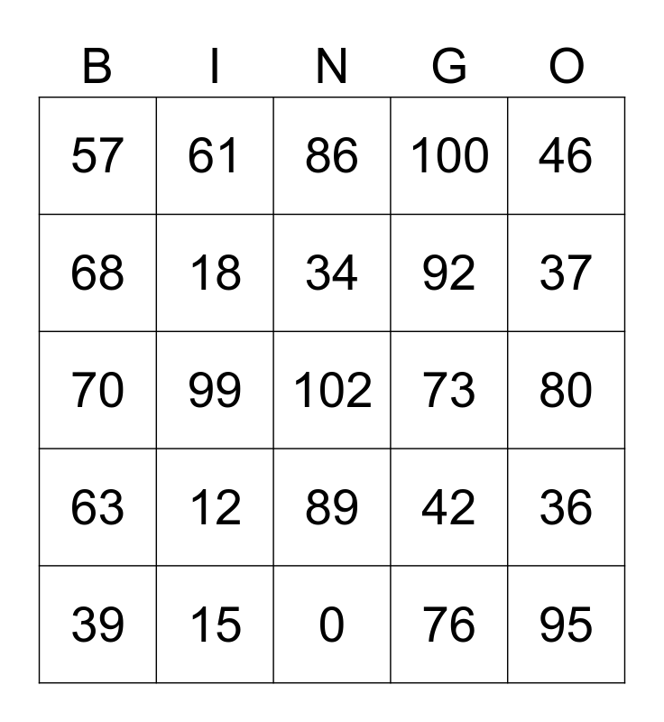 This bingo card has a free space and 24 words: 12, 15, 34, 39, 46, 57, 68, 61, 73, 89, 92, 70, 42, 36, 18, 76, 80, 86, 37, 99, 95, 63, 100 and 0.
