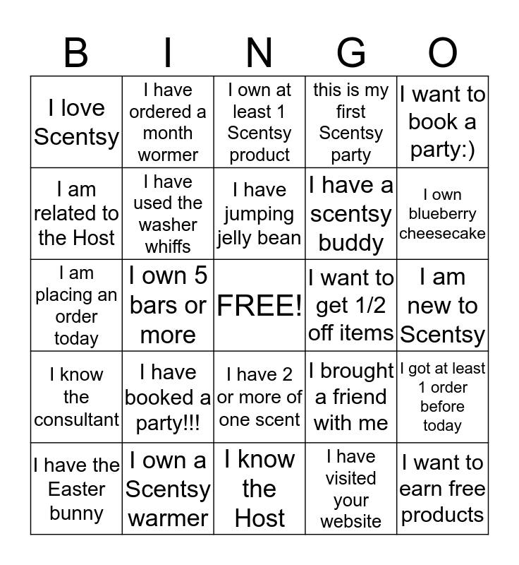 This bingo card has a free space and 24 words: I have booked a party!!!, I own a Scentsy warmer, I have jumping jelly bean, I have the Easter bunny, I want to book a party:), I love Scentsy, I am related to the Host, I have ordered a month wormer, I want to get 1/2 off items, I have 2 or more of one scent, I have a scentsy buddy, I am placing an order today, I brought a friend with me, I got at least 1 order before today, I have used the washer whiffs, I have visited your website, I am new to Scentsy, I own at least 1 Scentsy product, I own blueberry cheesecake, I own 5 bars or more, I want to earn free products, I know the consultant, this is my first Scentsy party and I know the Host.