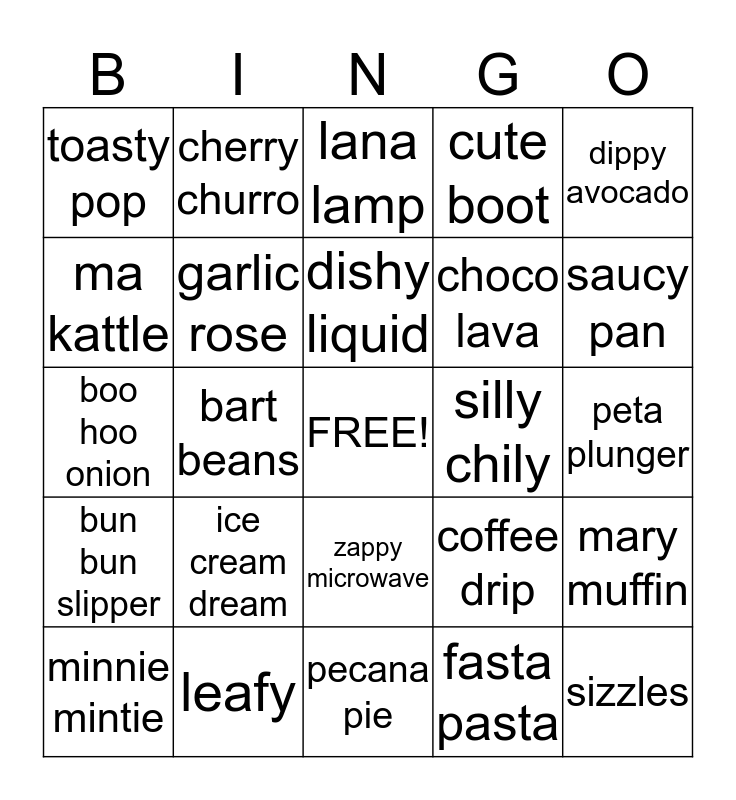 This bingo card has a free space and 24 words: ice cream dream, leafy, dishy liquid, minnie mintie, dippy avocado, toasty pop, ma kattle, cherry churro, silly chily, zappy microwave, choco lava, boo hoo onion, coffee drip, mary muffin, garlic rose, fasta pasta, peta plunger, lana lamp, saucy pan, bart beans, sizzles, bun bun slipper, cute boot and pecana pie.