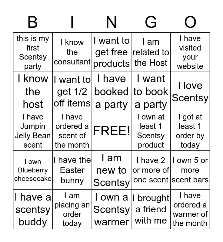 This bingo card has a free space and 24 words: I have the Easter bunny, I am placing an order today, I have booked a party, I have a scentsy buddy, I have visited your website, this is my first Scentsy party, I know the host, I know the consultant, I own at least 1 Scentsy product, I am new to Scentsy, I want to book a party, I have Jumpin Jelly Bean scent, I have 2 or more of one scent, I own 5 or more scent bars, I want to get 1/2 off items, I brought a friend with me, I got at least 1 order by today, I want to get free products, I love Scentsy, I have ordered a scent of the month, I have ordered a warmer of the month, I own Blueberry cheesecake, I am related to the Host and I own a Scentsy warmer.