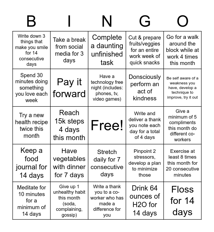 This bingo card has a free space and 28 words: Exercise at least 8 times this month for 20 consecutive minutes, Get a minimum of 7 hours of consistent sleep for at least 14 days, Donsciously perform an act of kindness, Drink 64 ounces of H2O for 14 days, Spend 30 minutes doing something you love each week, Complete a daunting unfinished task, Take a break from social media for 3 days, Keep a food journal for 14 days, Write and deliver a thank you note each day for a total of 4 days, Meditate for 10 minutes for a minimum of 14 days, Try a new health recipe twice this month, Cut & prepare fruits/veggies for an entire work week of quick snacks, Give up 1 unhealthy habit this month (soda, complaining, gossip), Write a thank you to a co-worker who has made a difference for you, Be self aware of a weakness you have, develop a technique to improve, try it out, Make your own goal for the month, obtain it, Have vegetables with dinner for 7 days, Pay it forward, Have a technology free night (includes: phones, tv, video games), Stretch daily for 7 consecutive days, Write down 3 things that make you smile for 14 consecutive days, Pinpoint 2 frequent stressors of yours, develope a plan to minimize each, Floss for 14 days, Reach 15k steps 4 days this month, Give a minimum of 5 compliments this month do different co-workers, Pinpoint 2 stressors, develop a plan to minimize those, Go for a walk around the block while at work 4 times this month and Take the stairs up to work 8 times this month.
