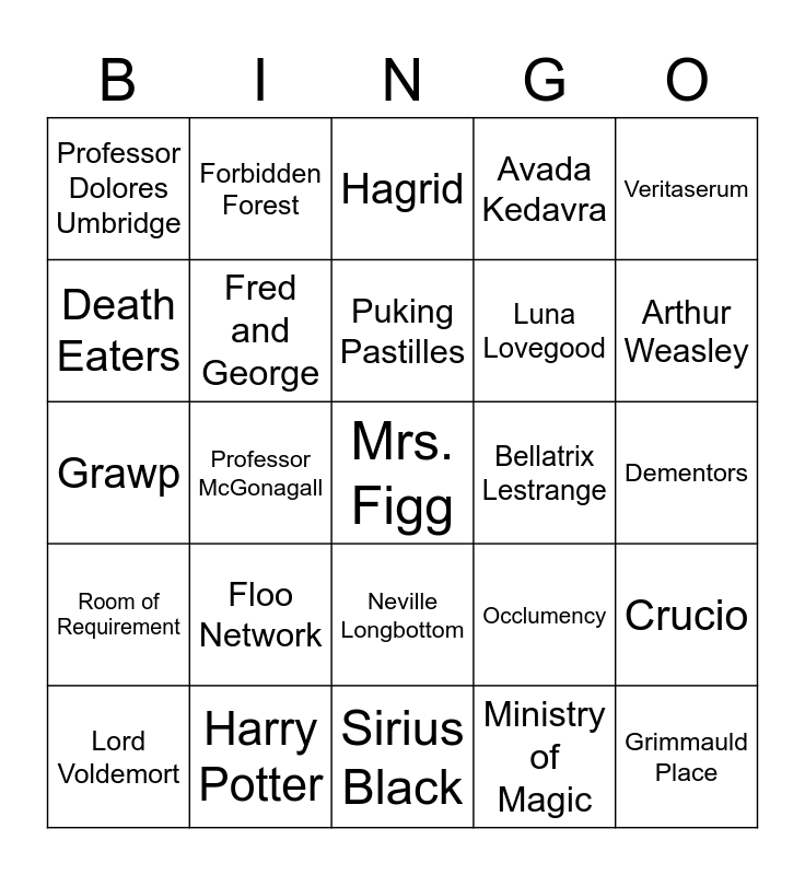This bingo card has 30 words: Harry Potter, Professor Dumbledore, Professor McGonagall, Professor Moody, Professor Dolores Umbridge, Hagrid, Fred and George, Neville Longbottom, Bellatrix Lestrange, Sirius Black, Dementors, Mrs. Figg, Ministry of Magic, Grimmauld Place, Arthur Weasley, Dumbledore's Army, Occlumency, Room of Requirement, Floo Network, Veritaserum, Grawp, Centaurs, Forbidden Forest, Luna Lovegood, Death Eaters, Avada Kedavra, Crucio, Lord Voldemort, Puking Pastilles and Mafalda Hopkirk.