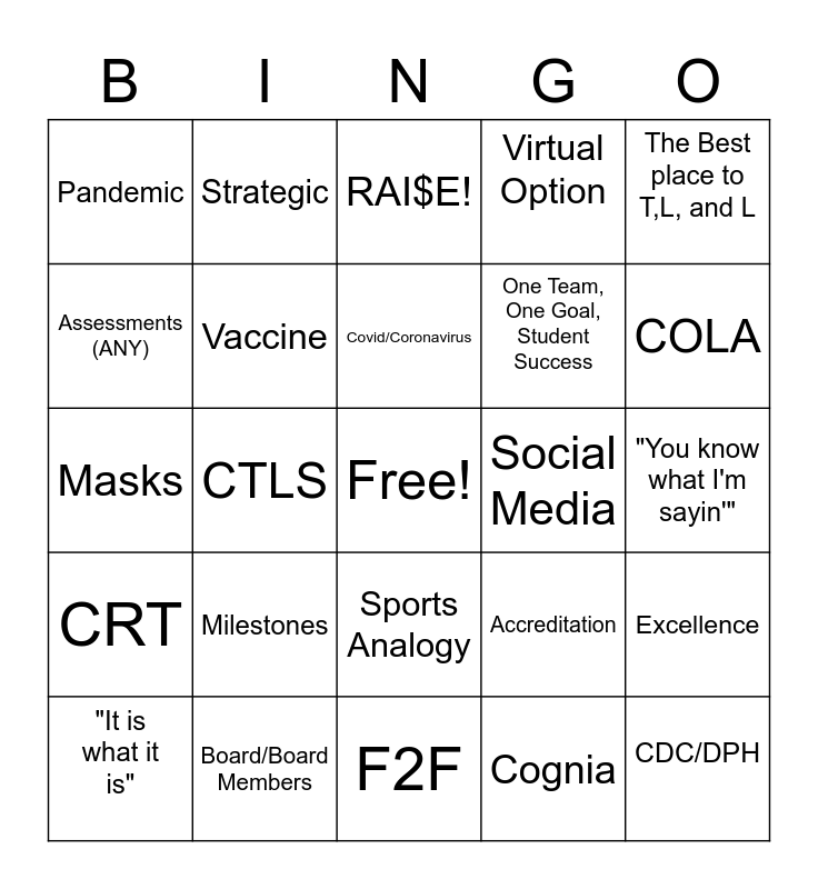 This bingo card has a free space and 24 words: Milestones, Board/Board Members, Covid/Coronavirus, "It is what it is", The Best place to T,L, and L, Pandemic, Assessments (ANY), Strategic, Social Media, Sports Analogy, One Team, One Goal, Student Success, Masks, Accreditation, Excellence, Vaccine, Cognia, "You know what I'm sayin'", RAI$E!, COLA, CTLS, CDC/DPH, CRT, Virtual Option and F2F.