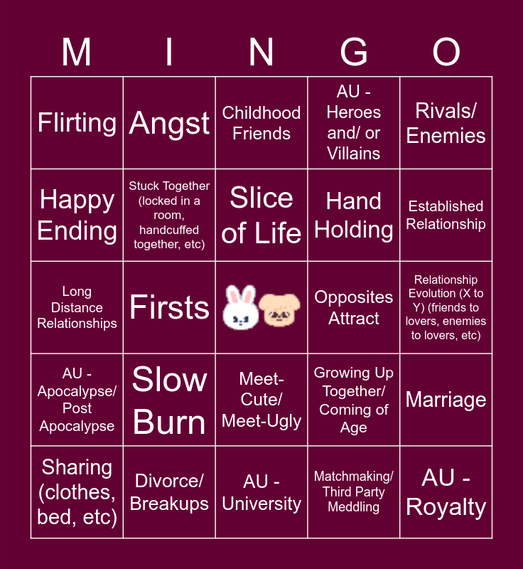 This bingo card has a free space and 24 words: Slow Burn, Divorce/ Breakups, Slice of Life, Sharing (clothes, bed, etc), Rivals/ Enemies, Flirting, Happy Ending, Angst, Opposites Attract, Meet-Cute/ Meet-Ugly, Hand Holding, Long Distance Relationships, Growing Up Together/ Coming of Age, Marriage, Stuck Together (locked in a room, handcuffed together, etc), Matchmaking/ Third Party Meddling, Relationship Evolution (X to Y) (friends to lovers, enemies to lovers, etc), Childhood Friends, Established Relationship, Firsts, AU - Royalty, AU - Apocalypse/ Post Apocalypse, AU - Heroes and/ or Villains and AU - University.