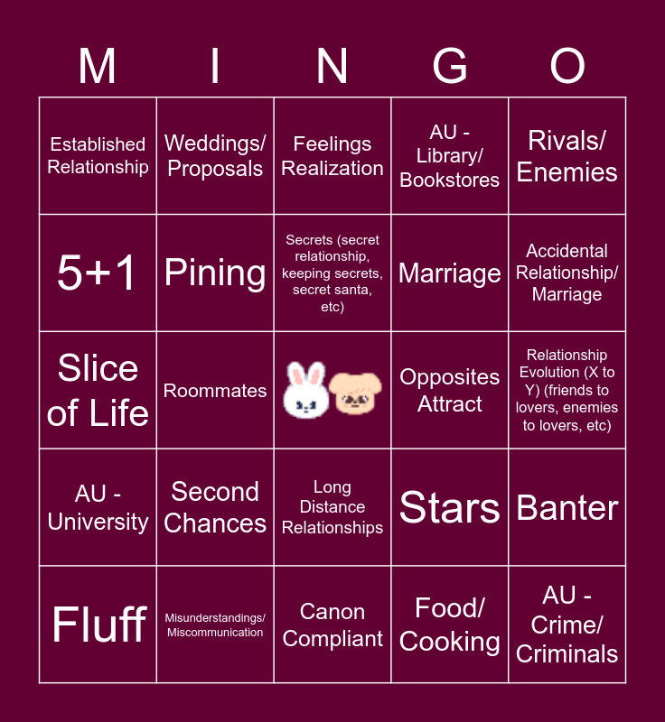 This bingo card has a free space and 24 words: Second Chances, Misunderstandings/ Miscommunication, Secrets (secret relationship, keeping secrets, secret santa, etc), Fluff, Rivals/ Enemies, Established Relationship, 5+1, Weddings/ Proposals, Opposites Attract, Long Distance Relationships, Marriage, Slice of Life, Stars, Banter, Pining, Food/ Cooking, Relationship Evolution (X to Y) (friends to lovers, enemies to lovers, etc), Feelings Realization, Accidental Relationship/ Marriage, Roommates, AU - Crime/ Criminals, AU - University, AU - Library/ Bookstores and Canon Compliant.