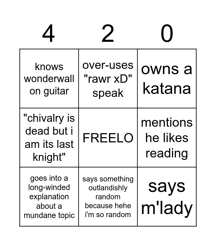 This bingo card has a free space and 8 words: mentions he likes reading, owns a katana, over-uses "rawr xD" speak, goes into a long-winded explanation about a mundane topic, knows wonderwall on guitar, says m'lady, "chivalry is dead but i am its last knight" and says something outlandishly random because hehe i'm so random.