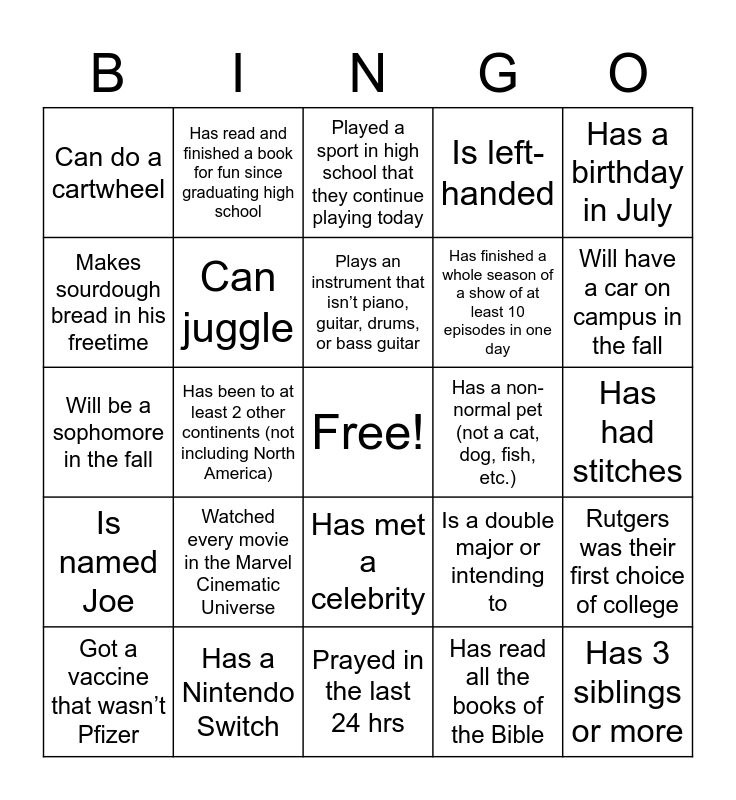 This bingo card has a free space and 24 words: Watched every movie in the Marvel Cinematic Universe, Has a Nintendo Switch, Plays an instrument that isn’t piano, guitar, drums, or bass guitar, Got a vaccine that wasn’t Pfizer, Has a birthday in July, Can do a cartwheel, Makes sourdough bread in his freetime, Has read and finished a book for fun since graduating high school, Has a non-normal pet (not a cat, dog, fish, etc.), Has met a celebrity, Has finished a whole season of a show of at least 10 episodes in one day, Will be a sophomore in the fall, Is a double major or intending to, Rutgers was their first choice of college, Can juggle, Has read all the books of the Bible, Has had stitches, Played a sport in high school that they continue playing today, Will have a car on campus in the fall, Has been to at least 2 other continents (not including North America), Has 3 siblings or more, Is named Joe, Is left-handed and Prayed in the last 24 hrs.