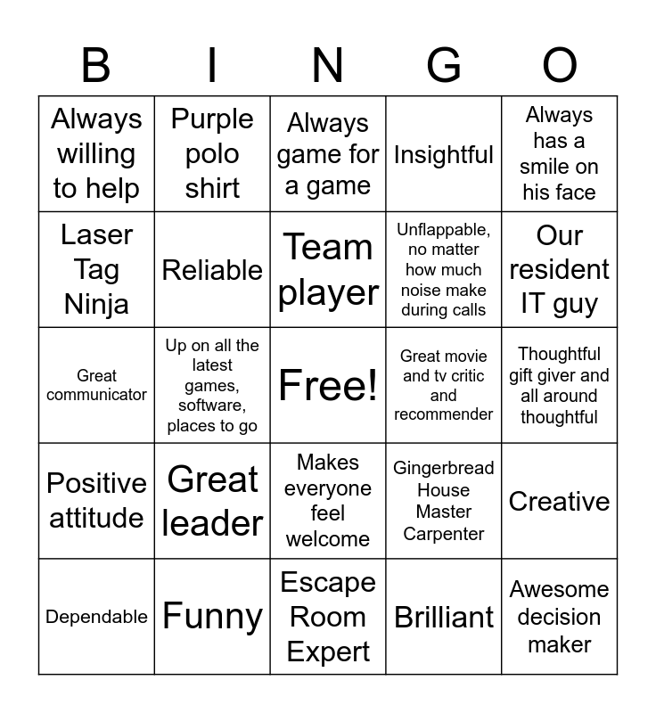 This bingo card has a free space and 39 words: Wishes he had pulled the trigger on a hydrogen fuel cell car, Guy who “naps” at night and then wakes up and does more work, Detail oriented, Reliable, Dependable, Makes everyone feel welcome, Team player, Problem Solving, Always has a smile on his face, Positive attitude, Up on all the latest games, software, places to go, Insightful, Awesome decision maker, Thoughtful gift giver and all around thoughtful, Great movie and tv critic and recommender, Great leader, Calm, cool and collected, Always willing to help, Worked US hours while quarantined in South Korea, Gingerbread House Master Carpenter, Laser Tag Ninja, Escape Room Expert, Unflappable, no matter how much noise make during calls, Our resident IT guy, Tech savvy, Walking dinosaur costume, The hot dog costume, Costume and prop aficionado, Colorful polo shirts, Purple polo shirt, Trivia Master, Team games master, Always game for a game, Funny, Brilliant, Fantastic lawyer, Creative, Great communicator and The glue of our team.