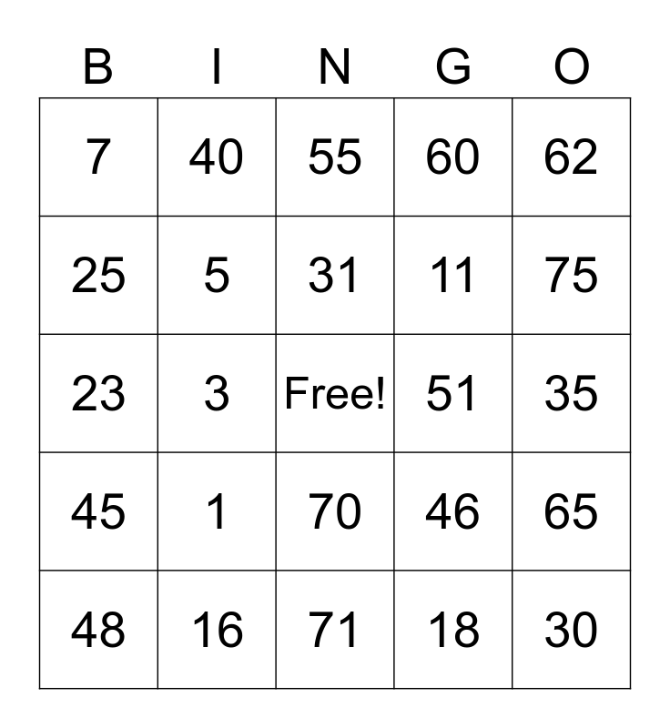 This bingo card has a free space and 24 words: 1, 16, 31, 48, 62, 7, 25, 40, 51, 70, 11, 23, 46, 65, 5, 18, 35, 55, 75, 3, 30, 45, 60 and 71.