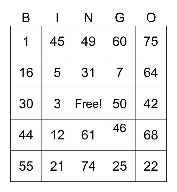 This bingo card has a free space and 24 words: 12, 21, 31, 55, 75, 1, 16, 45, 50, 61, 7, 30, 46, 68, 5, 25, 42, 49, 64, 3, 22, 44, 60 and 74.