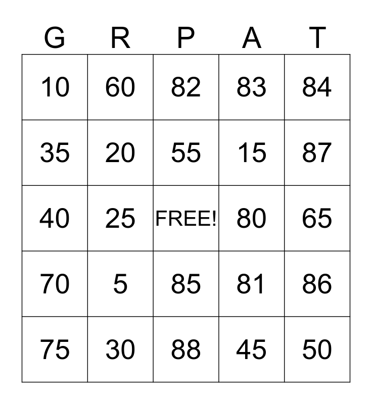 This bingo card has a free space and 24 words: 5, 30, 55, 75, 84, 10, 35, 60, 80, 85, 15, 40, 81, 86, 20, 45, 65, 82, 87, 25, 50, 70, 83 and 88.