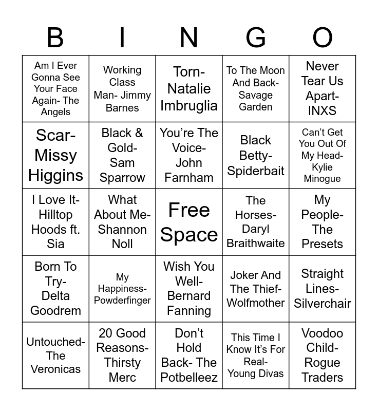 This bingo card has a free space and 24 words: My Happiness- Powderfinger, 20 Good Reasons- Thirsty Merc, You’re The Voice- John Farnham, Untouched- The Veronicas, Never Tear Us Apart- INXS, Am I Ever Gonna See Your Face Again- The Angels, Scar- Missy Higgins, Working Class Man- Jimmy Barnes, The Horses- Daryl Braithwaite, Wish You Well- Bernard Fanning, Black Betty- Spiderbait, I Love It- Hilltop Hoods ft. Sia, Joker And The Thief- Wolfmother, Straight Lines- Silverchair, Black & Gold- Sam Sparrow, This Time I Know It’s For Real- Young Divas, My People- The Presets, Torn- Natalie Imbruglia, Can’t Get You Out Of My Head- Kylie Minogue, What About Me- Shannon Noll, Voodoo Child- Rogue Traders, Born To Try- Delta Goodrem, To The Moon And Back- Savage Garden and Don’t Hold Back- The Potbelleez.