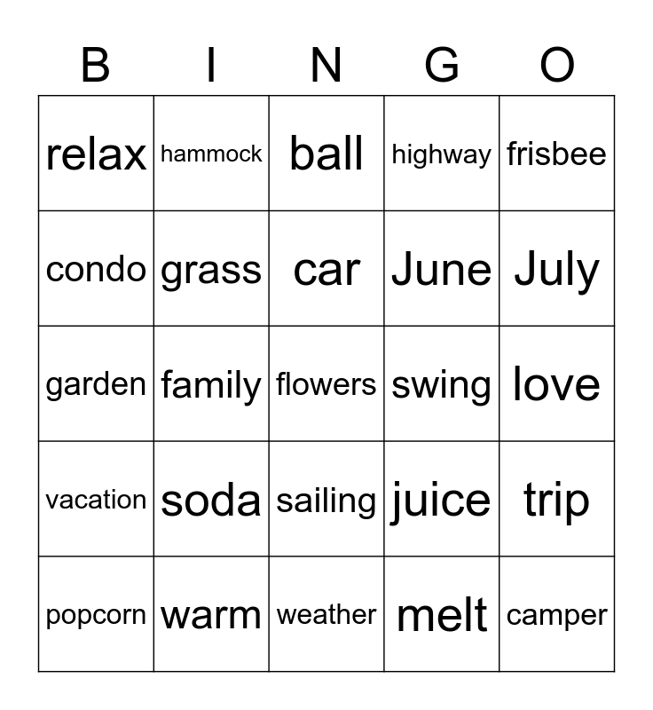 This bingo card has 75 words: Free!, August, ball, baseball, beach, berries, bikini, boat, burger, camp, camper, canoe, car, condo, daisy, family, fan, flowers, food, frisbee, fruit, garden, grass, hammock, highway, hiking, holiday, hot, hotdog, hotel, humidity, ice cream, journey, juice, July, June, kids, lotion, love, melt, motel, muggy, ocean, park, picnic, play, popcorn, relax, rest, restaurant, rose, sailing, sand, sandals, sea, seashore, shorts, showers, slide, snacks, soda, summer, sun, sunflower, swim, swing, tan, thunder, travel, trip, vacation, warm, water, weather and work.