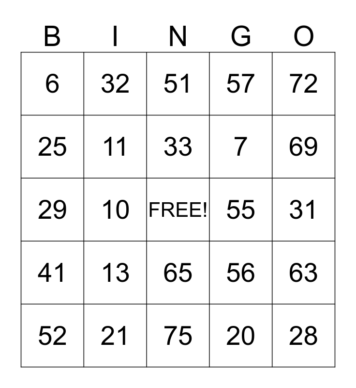 This bingo card has a free space and 24 words: 13, 21, 33, 52, 72, 6, 25, 32, 55, 65, 7, 29, 56, 63, 11, 20, 31, 51, 69, 10, 28, 41, 57 and 75.