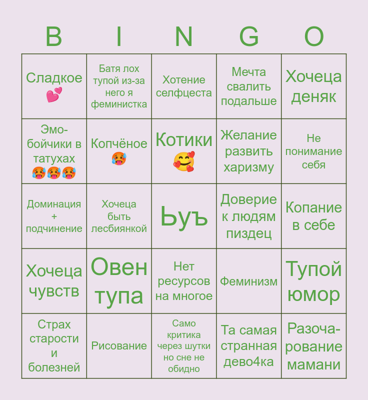 This bingo card has a free space and 24 words: Овен тупа, Рисование, Котики 🥰, Страх старости и болезней, Хочеца деняк, Сладкое 💕, Эмо-бойчики в татухах 🥵🥵🥵, Батя лох тупой из-за него я феминистка, Доверие к людям пиздец, Нет ресурсов на многое, Желание развить харизму, Доминация + подчинение, Феминизм, Тупой юмор, Копчёное 🥵, Та самая странная дево4ка, Копание в себе, Хотение селфцеста, Не понимание себя, Хочеца быть лесбиянкой, Разоча-рование мамани, Хочеца чувств, Мечта свалить подальше and Само критика через шутки но сне не обидно.