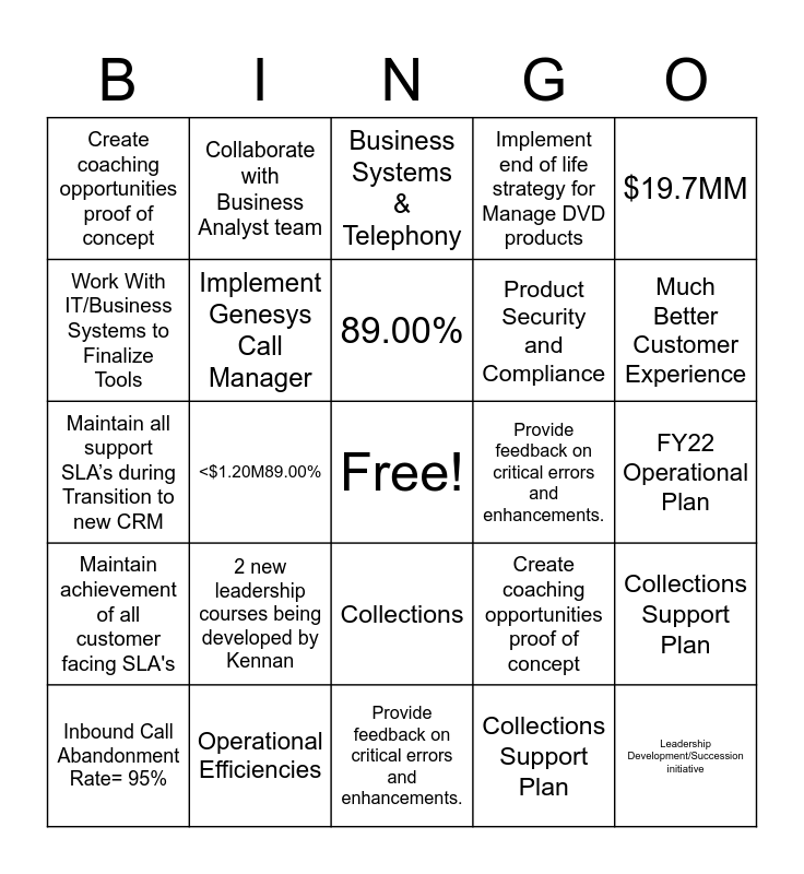 This bingo card has a free space and 74 words: Library, Retention Plan, Business Systems & Telephony, Improved Customer Awareness, Tech Assist, Operational, International Business Growth, Account Executives, Inbound Call Abandonment Rate= 95%, Implement new Business Systems for Support teams, Ensure Support teams are prepared to move over to phase 2, Operations, 89.00%, Work With IT/Business Systems to Finalize Tools, Execute Plan for Improving 1st Year Retention, <$1.20M89.00%, Inbound Response Rate<1 Minute=92%, Much Better Customer Experience, Goal for FY22 = 75.0%, Maintain all support SLA’s during Transition to new CRM, Implement Genesys Call Manager, Collaborate with Business Analyst team, Implement end of life strategy for Manage DVD products, Develop new coaching opportunities, Leadership Development/Succession initiative, Spanish Library support in Mexico, Goal for FY22 = 75.0%, Both Additional infrastructure, Development And Licensing Support, FY22 Operational Plan, Tech Support, $19.7MM, Potential for Tech-Assist mobile app, Collections, Cancel Survey Tool 2.0, Develop & Implement PSC tools, Collections Support Plan, Product Security and Compliance, National Accounts Support Plan, Maintain achievement of all customer facing SLA's, Begin Discussions For Developing Criteria, Provide feedback on critical errors and enhancements., Operational Efficiencies, Add $150K in ARR (~350 subs), Goal for FY22 = 75.0%, Create coaching opportunities proof of concept, Create coaching opportunities proof of concept, Possible pricing promotion to accelerate sunset, 2 new leadership courses being developed by Kennan, = 2,000 by end of FY22, New technologies such as chat and other process improvements, Goal for FY22 = 75.0%, Both Additional infrastructure, Development And Licensing Support, FY22 Operational Plan, Tech Support, $19.7MM, Potential for Tech-Assist mobile app, Collections, Cancel Survey Tool 2.0, Develop & Implement PSC tools, Collections Support Plan, Product Security and Compliance, National Accounts Support Plan, Maintain achievement of all customer facing SLA's, Begin Discussions For Developing Criteria, Provide feedback on critical errors and enhancements., Operational Efficiencies, Add $150K in ARR (~350 subs), Goal for FY22 = 75.0%, Create coaching opportunities proof of concept, Create coaching opportunities proof of concept, Possible pricing promotion to accelerate sunset, 2 new leadership courses being developed by Kennan, = 2,000 by end of FY22 and New technologies such as chat and other process improvements.