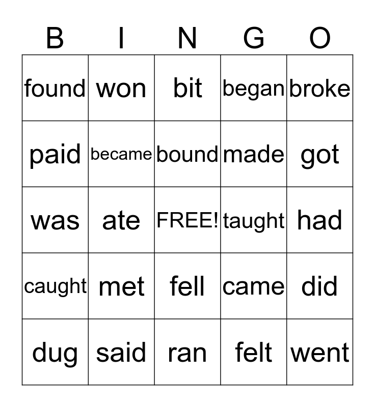 This bingo card has a free space and 24 words: met, said, bound, dug, broke, found, paid, won, taught, fell, made, was, came, did, became, felt, had, bit, got, ate, went, caught, began and ran.