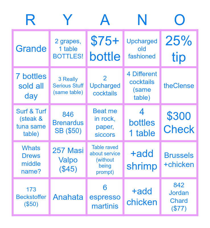 This bingo card has a free space and 24 words: 257 Masi Valpo ($45), Anahata, 2 Upcharged cocktails, 173 Beckstoffer ($50), 25% tip, Grande, 7 bottles sold all day, 2 grapes, 1 table BOTTLES!, 4 bottles 1 table, Table raved about service (without being prompt), 4 Different cocktails (same table), Surf & Turf (steak & tuna same table), +add shrimp, Brussels +chicken, 3 Really Serious Stuff (same table), +add chicken, $300 Check, $75+ bottle, theClense, 846 Brenardus SB ($50), 842 Jordan Chard ($77), Whats Drews middle name?, Upcharged old fashioned and 6 espresso martinis.