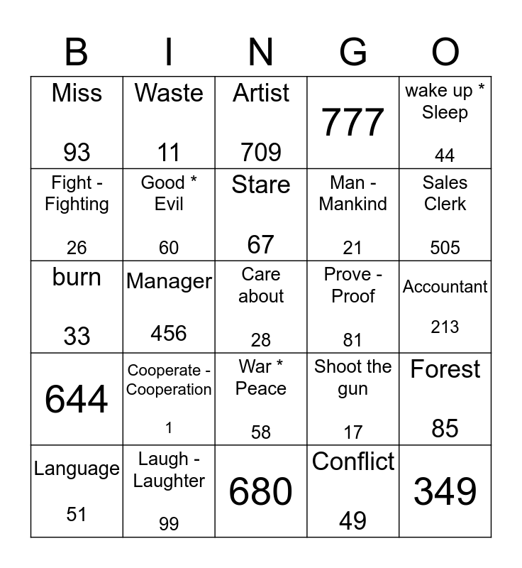 This bingo card has a free space and 24 words: Cooperate - Cooperation 1, Laugh - Laughter 99, Stare 67, Language 51, wake up * Sleep 44, Miss 93, Fight - Fighting 26, Waste 11, Prove - Proof 81, War * Peace 58, Man - Mankind 21, burn 33, Shoot the gun 17, Forest 85, Good * Evil 60, Conflict 49, Accountant 213, Artist 709, Sales Clerk 505, Manager 456, 349, 644, 777 and 680.