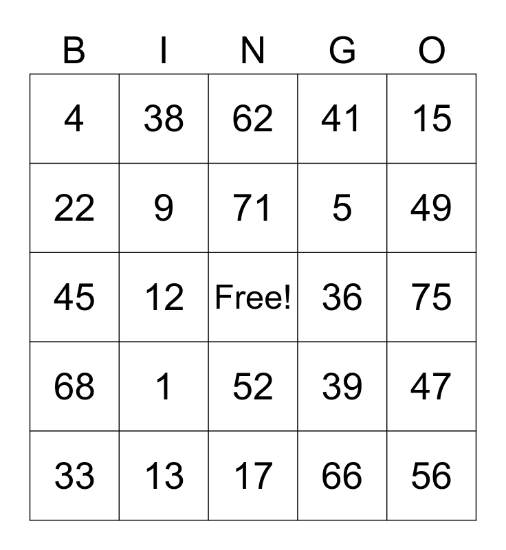 This bingo card has a free space and 24 words: 1, 13, 71, 33, 15, 4, 22, 38, 36, 52, 5, 45, 39, 47, 9, 66, 75, 62, 49, 12, 56, 68, 41 and 17.