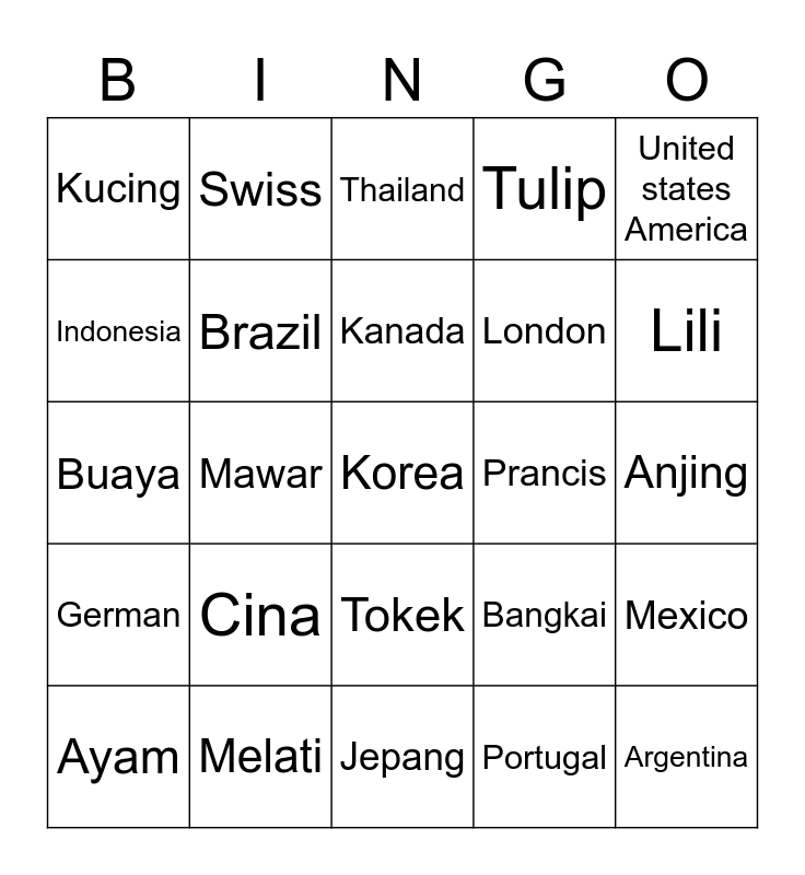 This bingo card has a free space and 24 words: Cina, Melati, Kanada, Ayam, United states America, Kucing, Indonesia, Swiss, Prancis, Tokek, London, Buaya, Bangkai, Mexico, Brazil, Portugal, Anjing, Thailand, Lili, Mawar, Argentina, German, Tulip and Jepang.