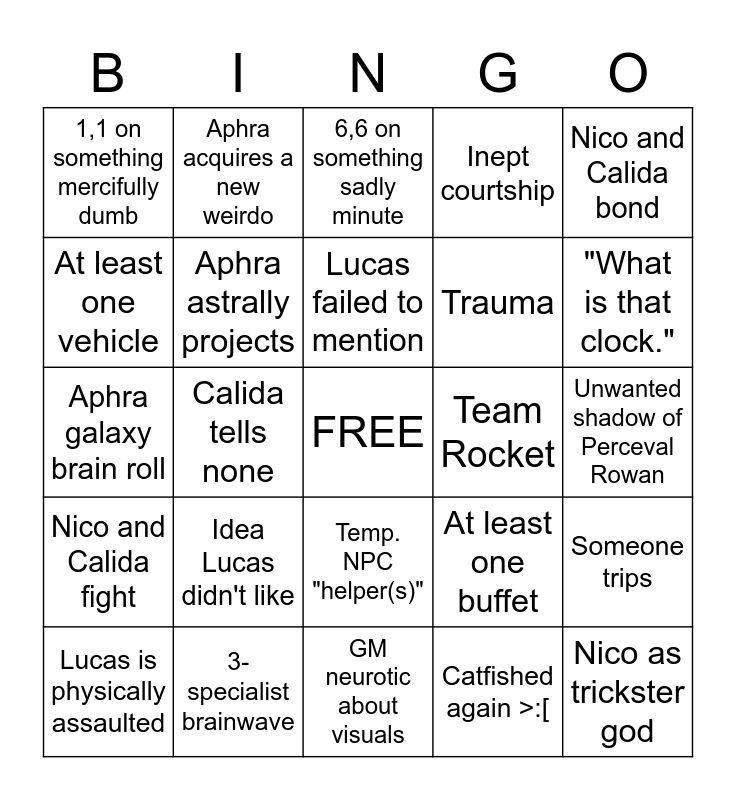 This bingo card has a free space and 29 words: Lucas is physically assaulted, Calida tells most, Calida tells none, Sad ghost, 1,1 on something mercifully dumb, 6,6 on something sadly minute, Aphra astrally projects, Idea Lucas didn't like, Team Rocket, 3-specialist brainwave, Unwanted shadow of Perceval Rowan, Nico as trickster god, GM neurotic about visuals, Catfished again >:[, "What is that clock.", Nico in themed outfit, Temp. NPC "helper(s)", Nico and Calida fight, Nico and Calida bond, Aphra galaxy brain roll, At least one buffet, Magic item/place get, Trauma, At least one vehicle, Inept courtship, Aphra acquires a new weirdo, Someone trips, Lucas failed to mention and "You can partially resist if you like".