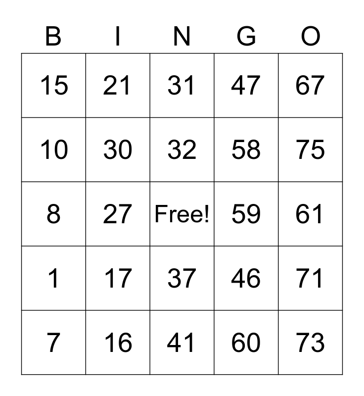 This bingo card has a free space and 24 words: 7, 17, 32, 60, 67, 15, 21, 31, 59, 61, 8, 30, 46, 71, 10, 16, 41, 47, 75, 1, 27, 37, 58 and 73.