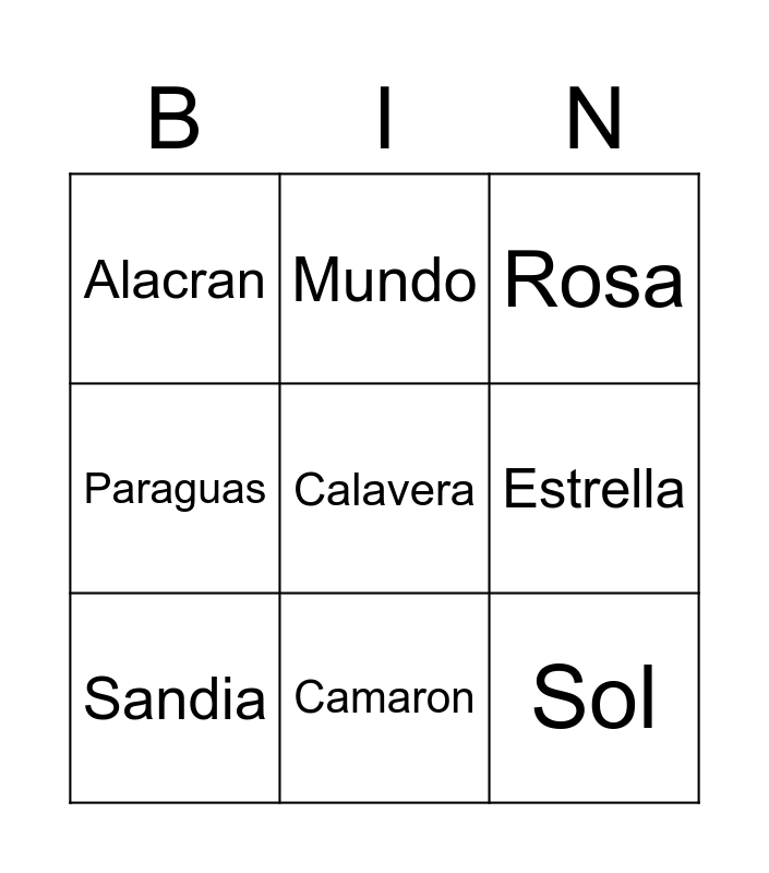 This bingo card has 15 words: Ninos, Gallo, Rosa, Alacran, Camaron, Calavera, Soldado, Araña, Estrella, Sol, arbol, Paraguas, Sandia, Mundo and Ninos.