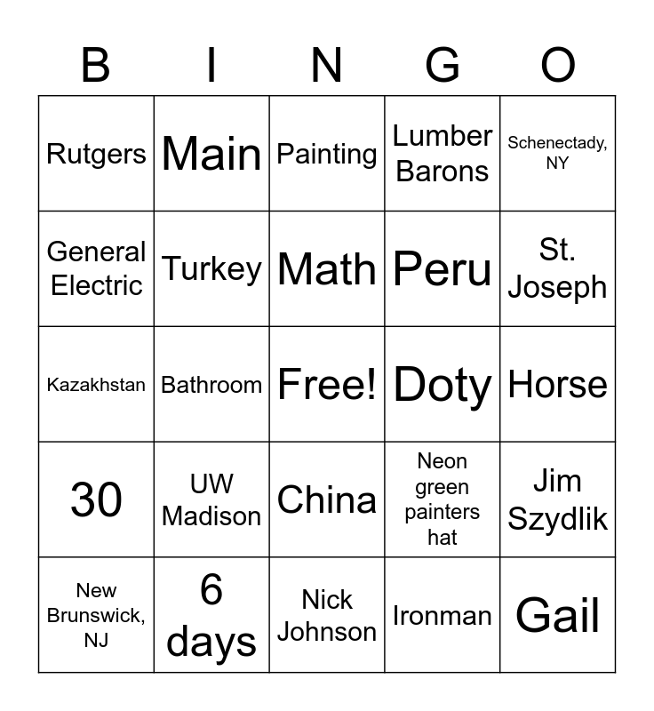 This bingo card has a free space and 24 words: UW Madison, 6 days, Math, New Brunswick, NJ, Schenectady, NY, Rutgers, General Electric, Main, Doty, China, Peru, Kazakhstan, Neon green painters hat, Jim Szydlik, Turkey, Ironman, Horse, Painting, St. Joseph, Bathroom, Gail, 30, Lumber Barons and Nick Johnson.
