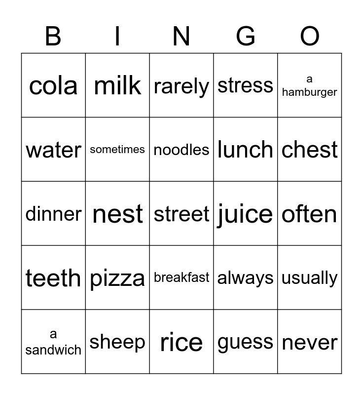 This bingo card has 25 words: pizza, rice, noodles, a sandwich, a hamburger, cola, water, milk, juice, breakfast, lunch, dinner, always, usually, sometimes, never, often, rarely, chest, nest, street, sheep, teeth, stress and guess.