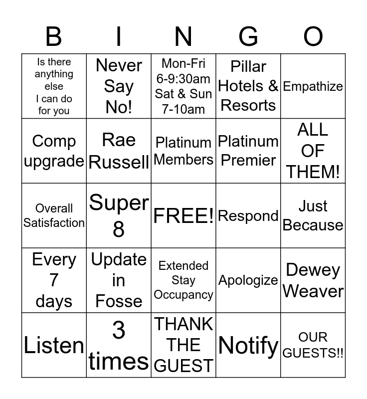 This bingo card has a free space and 24 words: Update in Fosse, 3 times, Platinum Members, Listen, Empathize, Is there anything else I can do for you, Comp upgrade, Never Say No!, Respond, Extended Stay Occupancy, Platinum Premier, Overall Satisfaction, Apologize, Dewey Weaver, Rae Russell, Notify, Just Because, Mon-Fri 6-9:30am Sat & Sun 7-10am, ALL OF THEM!, Super 8, OUR GUESTS!!, Every 7 days, Pillar Hotels & Resorts and THANK THE GUEST.