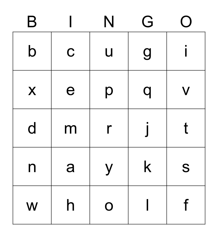This bingo card has a free space and 24 words: a, h, p, w, i, b, x, c, j, y, q, d, k, s, e, l, t, u, v, m, f, n, g and o.