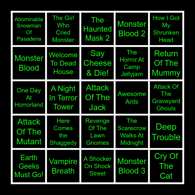 This bingo card has a free space and 33 words: Night Of The Living Dummy, The Haunted Mask, Say Cheese & Die!, The Werewolf Of Fever Swamp, Attack Of The Graveyard Ghouls, Abominable Snowman Of Pasadena, Welcome To Dead House, A Shocker On Shock Street, The Horror At Camp Jellyjam, Cry Of The Cat, Monster Blood, The Girl Who Cried Monster, The Curse Of The Mummy's Tomb, Calling All Creeps, One Day At Horrorland, A Night In Terror Tower, Revenge Of The Lawn Gnomes, The Scarecrow Walks At Midnight, Deep Trouble, Attack Of The Mutant, Vampire Breath, Night Of The Living Dummy 2, Monster Blood 2, Return Of The Mummy, Earth Geeks Must Go!, Here Comes the Shaggedy, The Haunted Mask 2, Awesome Ants, How I Got My Shrunken Head, The Blob That Ate Everyone, A Holly Jolly Holiday, Monster Blood 3 and Beware of the Purple Peanut Butter.