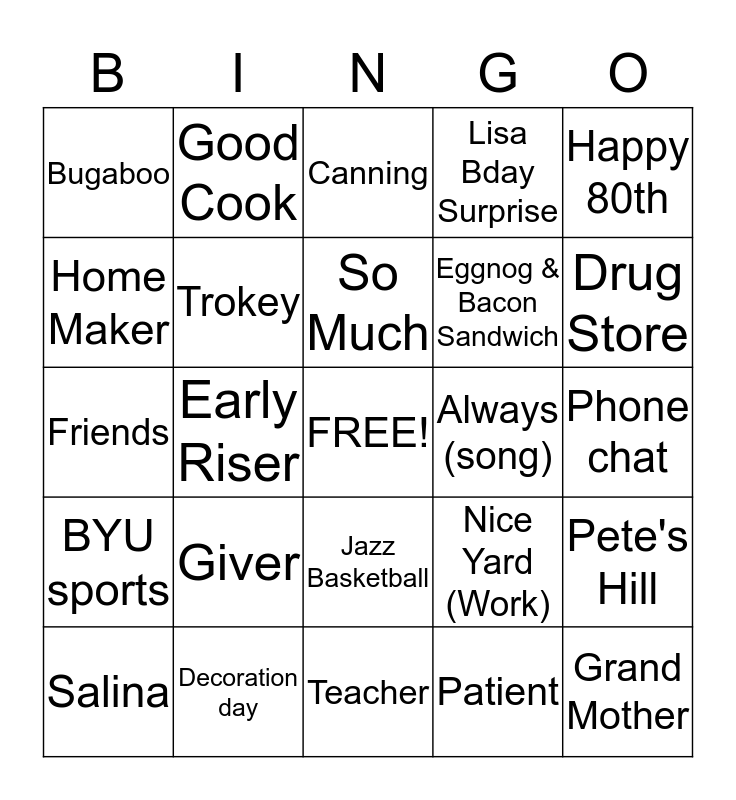 This bingo card has a free space and 46 words: Mother, Grand Mother, Great Grand Mother, Teacher, Giver, Hard Worker, Good Cook, Wife, Home Maker, Diet Coke, Trokey, Lisa Bday Surprise, Pete's Hill, Nice Yard (Work), Family, Service, So Much, Always (song), Sunday Dinner Roast Beef, Happy 80th, Early Riser, Patient, Bugaboo, Eggnog & Bacon Sandwich, Ironing, Drug Store, Salina, April 2, 1935, Jazz Basketball, BYU sports, Travel, Home Decor, Holidays, Nice car, Deer hunt for family time, Decoration day, Phone chat, Shopping, Testimony, Selfless, Reading, Canning, Friends, Peonies, Friends and Antone's Interiors.