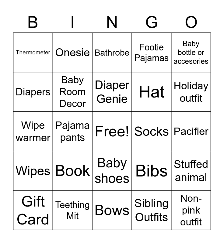 This bingo card has a free space and 24 words: Book, Teething Mit, Diaper Genie, Gift Card, Baby bottle or accesories, Thermometer, Diapers, Onesie, Socks, Baby shoes, Hat, Wipe warmer, Bibs, Stuffed animal, Baby Room Decor, Sibling Outfits, Pacifier, Bathrobe, Holiday outfit, Pajama pants, Non-pink outfit, Wipes, Footie Pajamas and Bows.