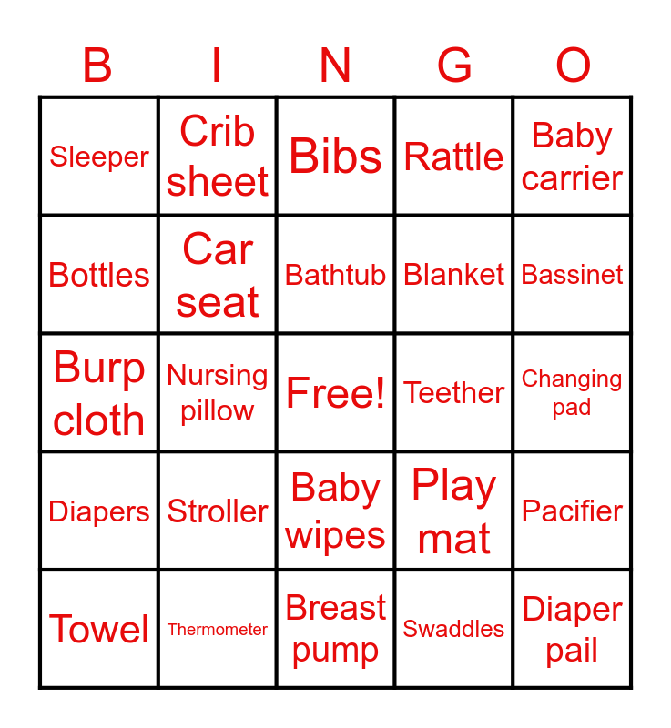 This bingo card has a free space and 28 words: Pacifier, Onesie, Blanket, Swaddles, Bottles, Bibs, Crib sheet, Diapers, Teether, Towel, Burp cloth, Rattle, Thermometer, Breast pump, Bassinet, High chair, Stroller, Car seat, Bathtub, Baby wipes, Sleeper, Feeding spoons, Diaper pail, Nursing pillow, Changing pad, Play mat, Baby carrier and Baby sound machine.