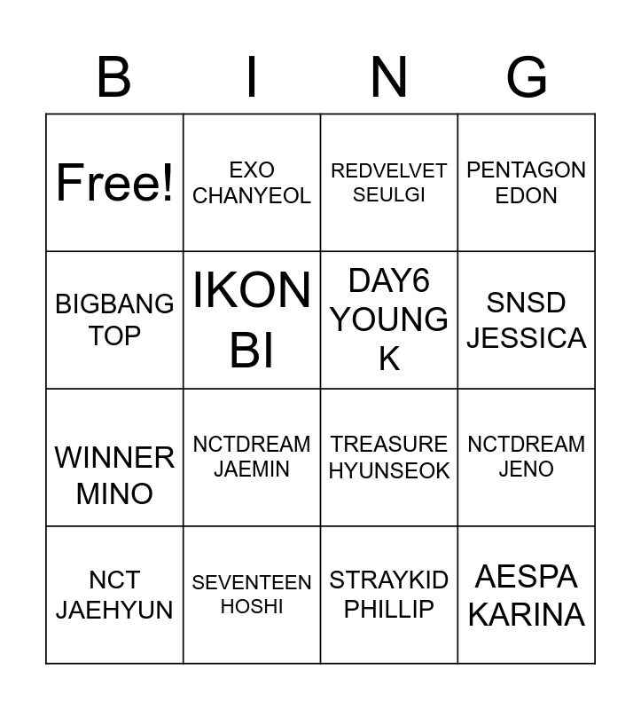 This bingo card has 16 words: NCT JAEHYUN, SEVENTEEN HOSHI, REDVELVET SEULGI, PENTAGON EDON, BIGBANG TOP, EXO CHANYEOL, TREASURE HYUNSEOK, NCTDREAM JENO, Free!, IKON BI, STRAYKID PHILLIP, SNSD JESSICA, WINNER MINO, NCTDREAM JAEMIN, DAY6 YOUNG K and AESPA KARINA.