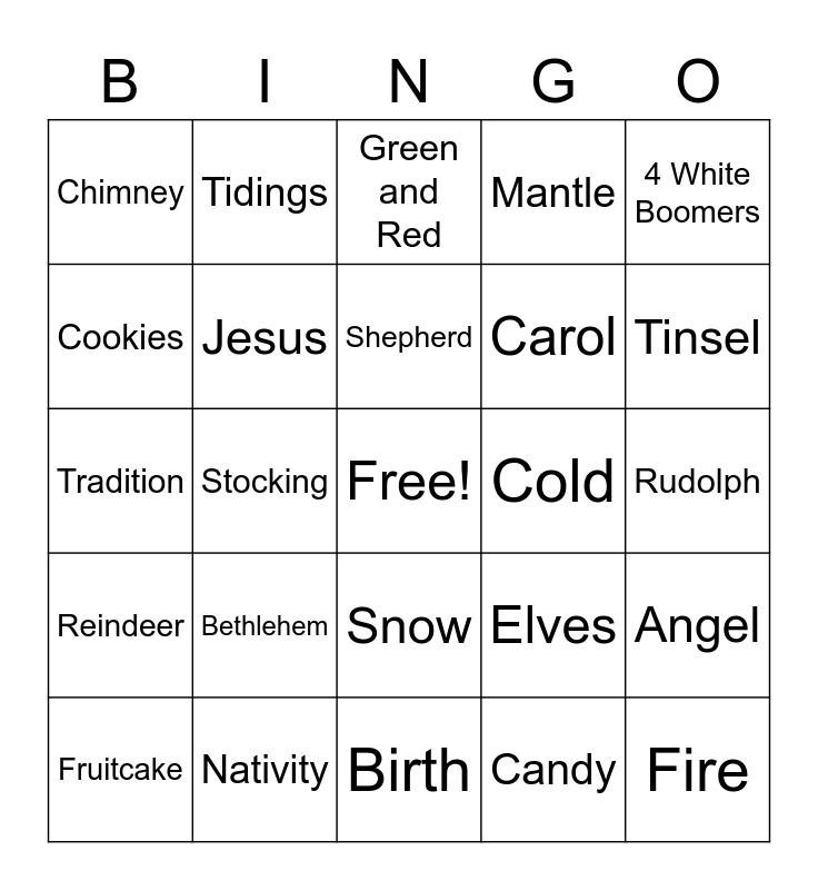 This bingo card has a free space and 37 words: July, Christmas, Santa, Jesus, Angel, Bethlehem, Shepherd, Mistletoe, 4 White Boomers, Hat, Stocking, Mantle, Fire, Rudolph, Cookies, Reindeer, Gingerbread, Green and Red, Snow, Cold, Chimney, Tinsel, Fruitcake, Birth, Baby, Candy, Tidings, Presents, Family, Fun, Carols, Nativity, Tradition, Ornament, Elves, Carol and Sleigh.