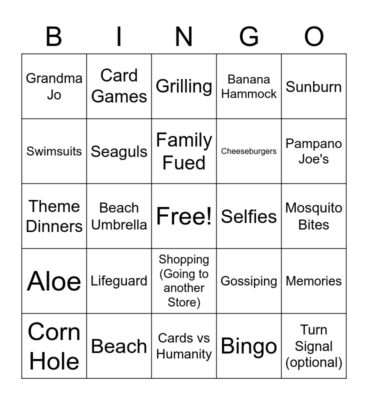 This bingo card has a free space and 24 words: Lifeguard, Beach, Family Fued, Corn Hole, Sunburn, Grandma Jo, Swimsuits, Card Games, Selfies, Shopping (Going to another Store), Cheeseburgers, Theme Dinners, Gossiping, Memories, Seaguls, Bingo, Mosquito Bites, Grilling, Pampano Joe's, Beach Umbrella, Turn Signal (optional), Aloe, Banana Hammock and Cards vs Humanity.