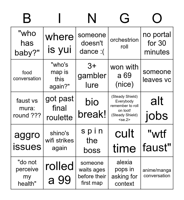 This bingo card has a free space and 24 words: shino's wifi strikes again, rolled a 99, 3+ gambler lure, "do not perceive my health", no portal for 30 minutes, "who has baby?", food conversation, where is yui, (Steady Shield) Everybody remember to roll on loot! (Steady Shield) <se.2>, s p i n the boss, won with a 69 (nice), faust vs mura: round ???, cult time, "wtf faust", "who's map is this again?", alexia pops in asking for context, alt jobs, someone doesn't dance :(, someone leaves vc, got past final roulette, anime/manga conversation, aggro issues, orchestrion roll and someone waits ages before their first map.