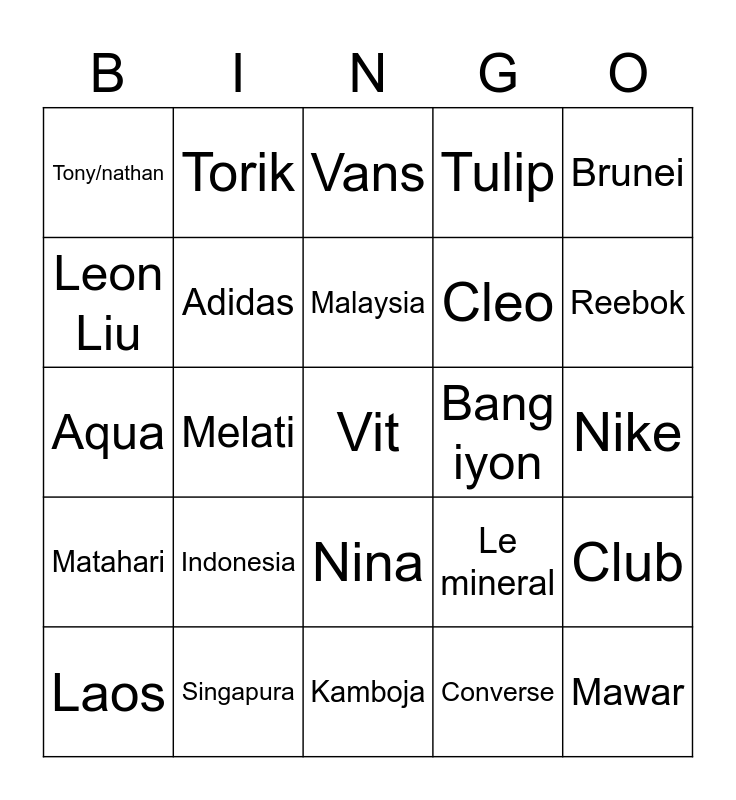 This bingo card has a free space and 24 words: Indonesia, Singapura, Malaysia, Laos, Brunei, Tony/nathan, Leon Liu, Torik, Bang iyon, Nina, Cleo, Aqua, Le mineral, Club, Adidas, Converse, Nike, Vans, Reebok, Melati, Mawar, Matahari, Tulip and Kamboja.
