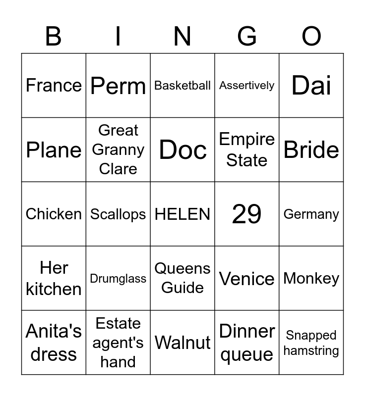 This bingo card has a free space and 39 words: Nun, Two front teeth, Irish, Great Granny Clare, Anita's dress, Queens Guide, Doc, Appendix, Dai, Her kitchen, Scallops, Assertively, Snapped hamstring, Germany, 29, Drumglass, Green ridge, France, Head, Venice, Plane, Walnut, Empire State, Bride, Dominic, Meths, Maire, Viola, 21 or 100, Perm, Risk, Bear, Basketball, Estate agent's hand, Dinner queue, Borneo, Monkey, Chicken and Orangutan.